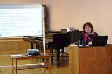 В своем выступлении Екатерина Викторовна подробно остановилась на вопросах перехода преподавателей ДМШ, ДШИ на Профессиональные стандарты, познакомила с изменениями в аттестации педагогических кадров и работе с электронным портфолио преподавателя.